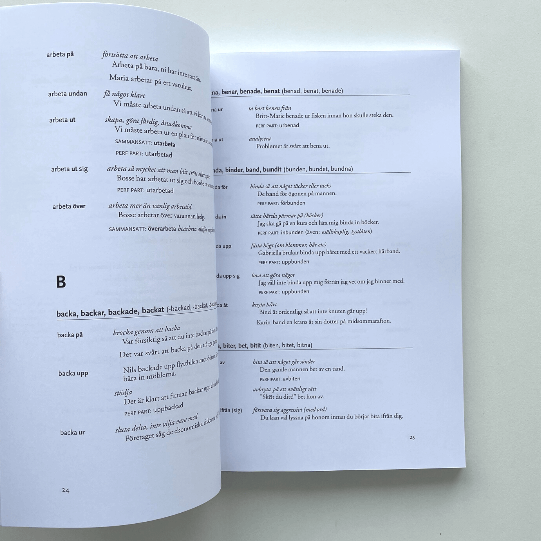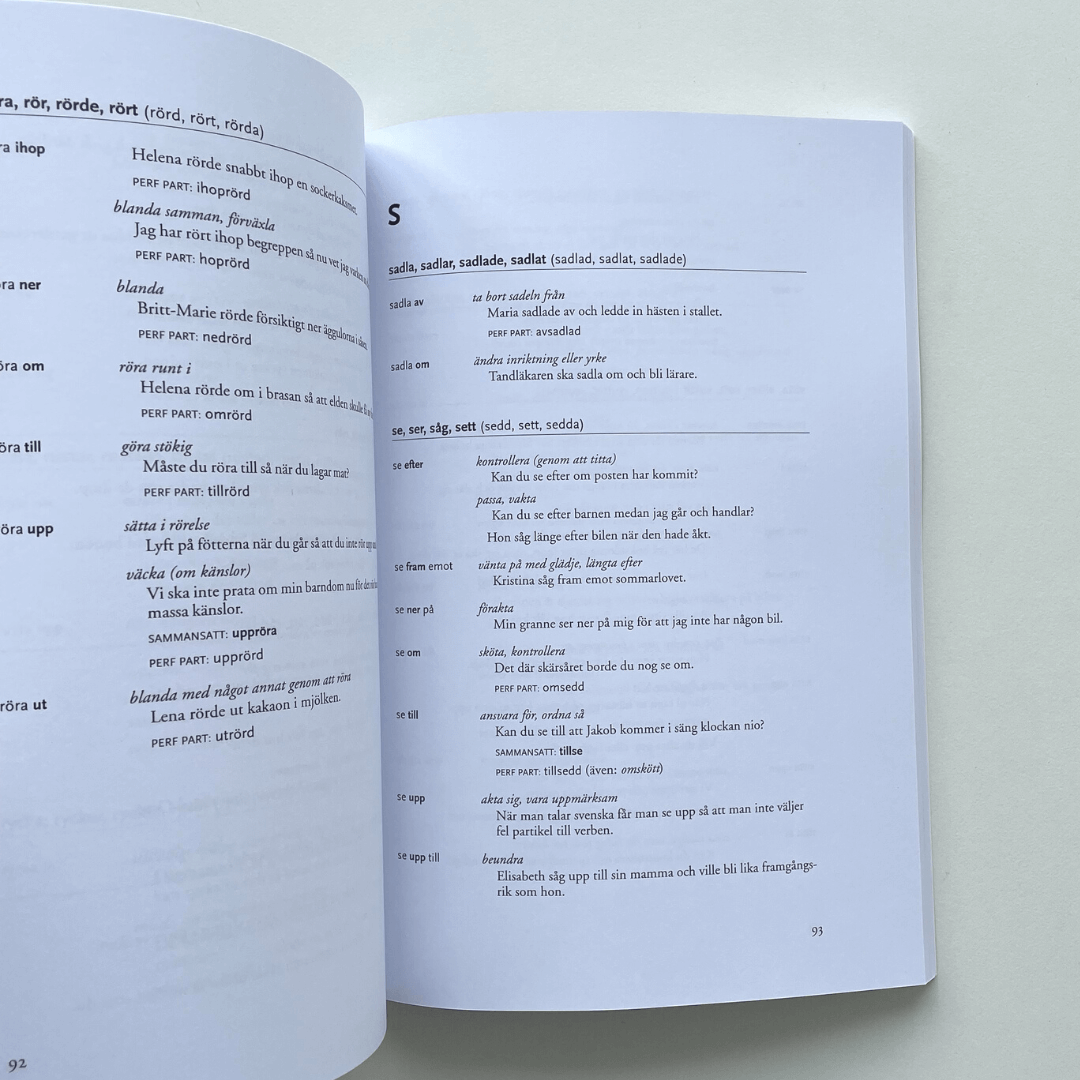 Każde słowo jest wyjaśnione po szwedzku oraz użyte w kontekście.